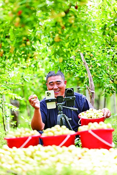 在江苏泗洪县一社区的枣园,枣农通过网络直播推介当地的奶油沙枣。新华社发