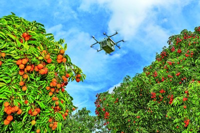 广东广州市一荔枝园内,物流无人机运输刚刚采摘的荔枝。新华社发